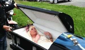 Женщину привезли в закрытом черном гробу, размещенном на катафалке, который никак не используют для свадебной церемонии. Уже немолодая невеста - в апреле ей исполнилось 58 лет - решила таким образом разыграть гостей и родню.