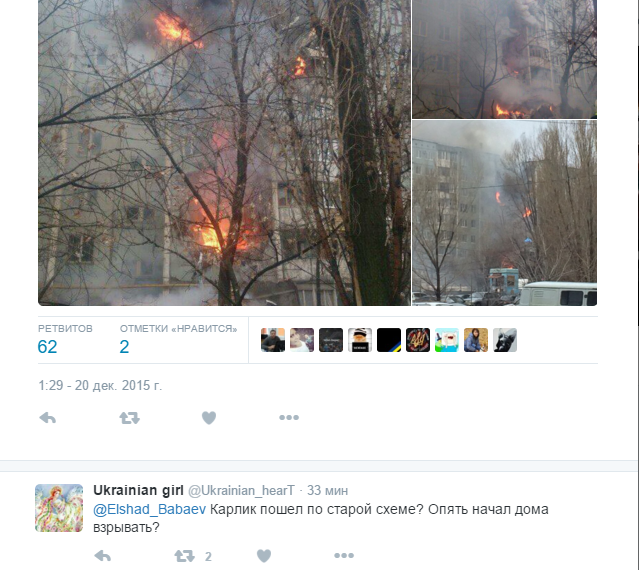 "Карлик пошел по старой схеме? Опять начал дома взрывать?", - комментирует взрыв одна из пользователей.