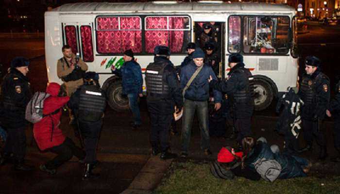 В сеть выложили видео с жестким задержанием участников акции протеста российскими правоохранителями. Несмотря на то, что среди них были девушки, их силой затолкали в автобус, едва они развернули свой черный баннер.