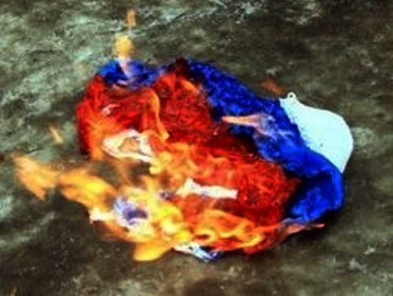 В Луганске, в центре города, «милиция» «ЛНР» задержала юношей и девушку за сожжения флага России.