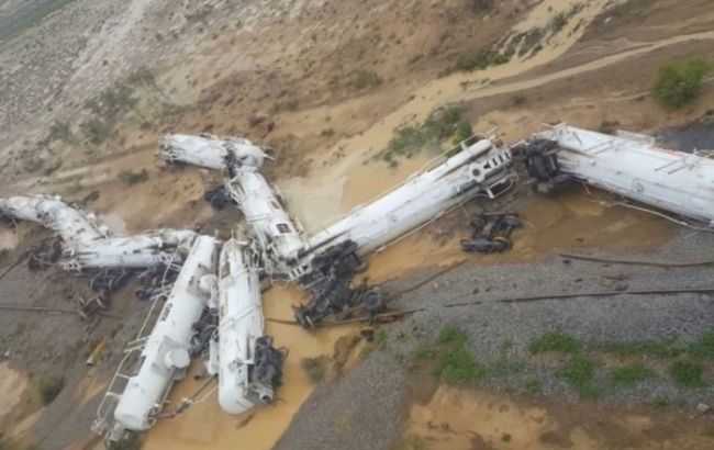 Полиция установила зону отчуждения в радиусе 2 км от места аварии, отменены перевозки на этом участке железной дороги.