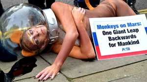 Ее ассистенты вылили на асфальт у её головы красную краску, обозначающую кровь. Таким жестом, звезда протестует против жестокой и негуманной идеи Роскосмоса отправить в 2017 году на Марс четырех обезьян.