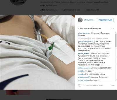В своем микроблоге Instagram девушка опубликовала снимок из больницы и сообщила, что она пребывает в медучреждении «Водников». Перед тем, как разместить фото с тюменской больницы, бывшая участница «Дома-2» написала в соцсети пост о том, что она на протяжении шести часов терпит боль в области живота. Кроме этого, Элина жаловалась на «скорую помощь», которая опаздывает. Девушка призналась, что она находится в полуобморочном состоянии и воет от резкой боли.
