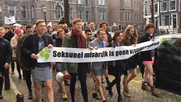 В Амстердаме мужчины, одев на себя мини-юбки, вышли на улицы митинговать в защиту женщин Кельна, которые подверглись сексуальному насилию со стороны мигрантов из Сирии и других стран.