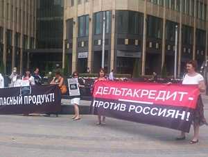 Несколько десятков заемщиков с валютной ипотекой собрались сегодня в центре Москвы возле офиса банка «ДельтаКредит» с требованием предоставить им справедливые условия рефинансирования валютных кредитов, расплачиваться по которым при текущем курсе доллара они не могут.