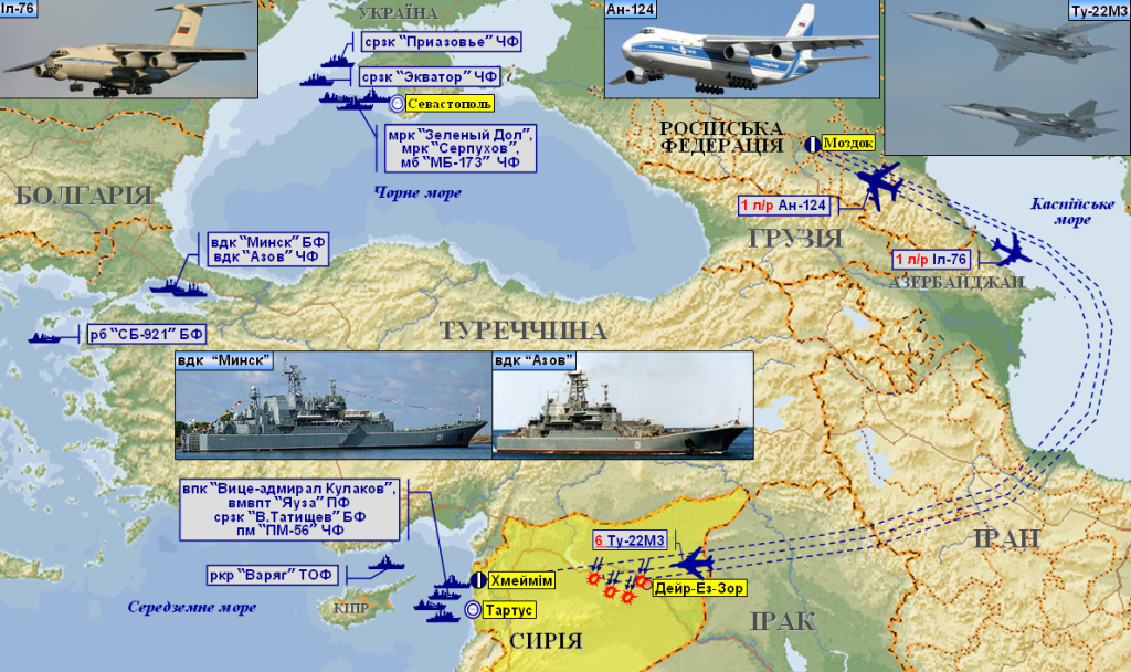 - проход через пролив Босфор в направлении Средиземного моря больших десантных кораблей "Минск" БФ и "Азов" ЧФ (по своим техническим характеристикам могут перевозить в различных вариантах: 150 морских пехотинцев и 13 боевых бронированных машин; 150 десантников и 10 танков с экипажами; 500 тонн груза).