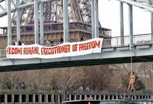 Девушки подготовили акцию с имитацией повешения. На одном из мостов столицы перед Эйфелевой башней разместили большой англоязычный плакат "Welcome Rohani, executioner of freedom" ("Добро пожаловать, Рухани, палач свободы"). А под мост спустили полуобнаженную участницу с фальшивой петлей на шее. На груди у девушки был нарисован флаг Ирана.