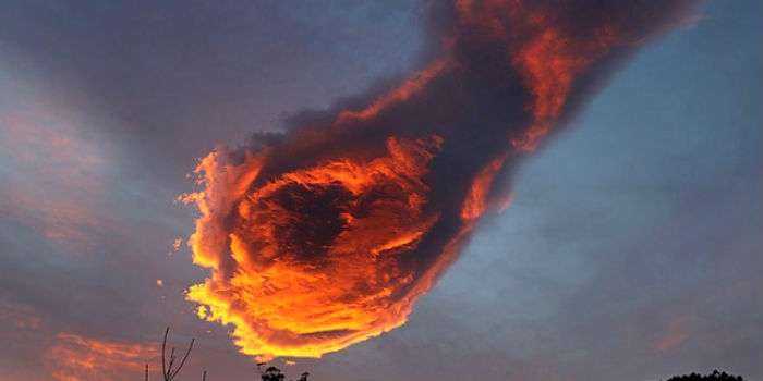 В небе Португалии удалось сфотографировать очень красивое и одновременно жуткое по форме облако. Оно появилась над островом Мадейра. Облако имело ярко оранжевый цвет, а по форме напоминало кулак или руку, которая держит огненный шар.