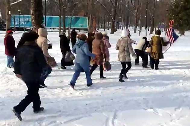 Бабушки среагировали на флаг "стратегического противника" как бык во время корриды на красную тряпку - попросту напросились на пикетчицу. Ее несколько раз ударили, а флаг отобрали. После этого пенсионерки дружно по нему потоптались.
