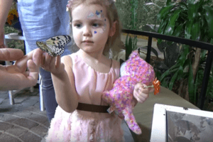 "Подарки и шарики Кате на День Рождения. Катя с семьей еде на розовом лимузине GMC в парк Бабочек и цветов, ищем золотые серёжки с кошечкой и принимаем поздравления с тортиком в отеле", - говорится под видео.