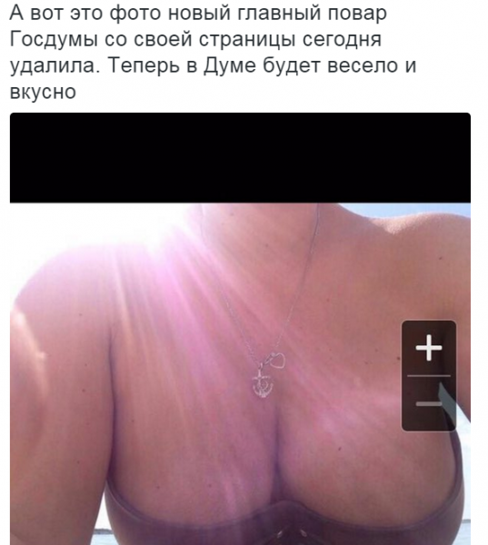 Вовк является директором комбината питания №4 управделами президента России, пишет "Московский комсомолец". "А вот это фото новый главный повар Госдумы со своей страницы сегодня удалила. Теперь в Думе будет весело и вкусно", – написал парламентарий в Twitter.