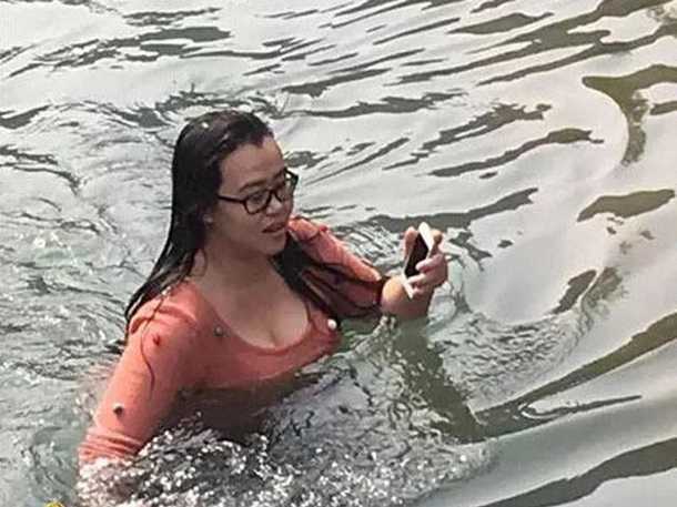В Пекине, столице Китая, женщина в одежде нырнула в холодное озеро, чтобы достать случайно упавший в воду смартфон iPhone 5.