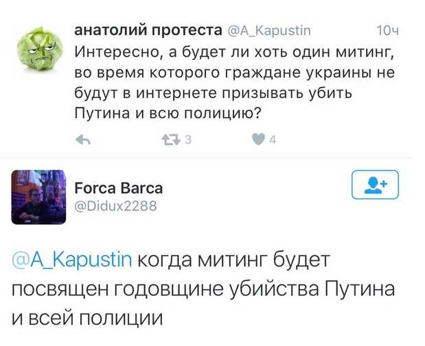 «Интересно, а будет ли хоть один митинг, во время которого граждане Украины не будут в интернете призывать убить Путина и всю полицию?», — написал он, на что в комментариях получил остроумный ответ.