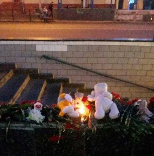 В Москве к выходу метро "Октябрьское поле", где в понедельник, 29 февраля, сотрудники полиции задержали женщину, с головой ребенка в руке, жители столицы несут цветы и игрушки.