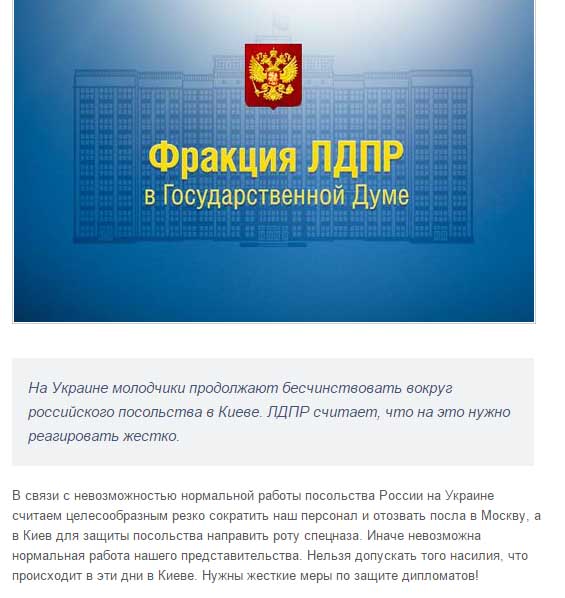 Уже сегодня партия ЛДПР выдвинула предложение отозвать из офиса в Украине всех работников и направить в Киев российский спецназ.