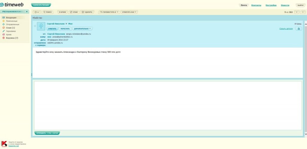 Согласно информации, размещенной в данном письме, которое пришло на электронную почту убийцы, неизвестный обратился с просьбой за крупную сумму ликвидировать Екатерину и Александра Винокуровых, - сообщает Российский Диалог.