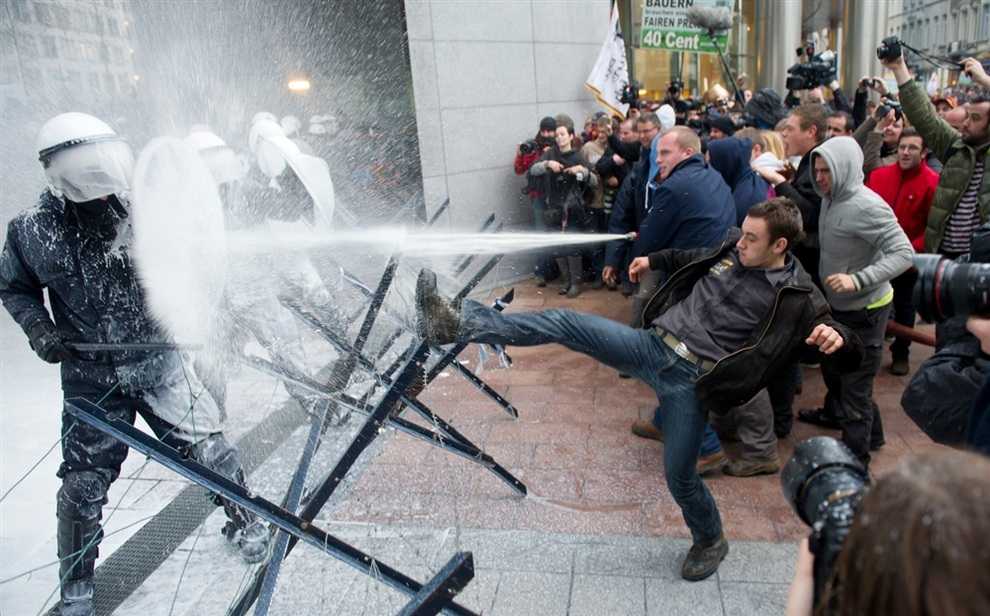 В бельгийской столице Брюсселе местные фермеры устроили акцию протеста, во время которой они буквально заливали молоком административные здания.