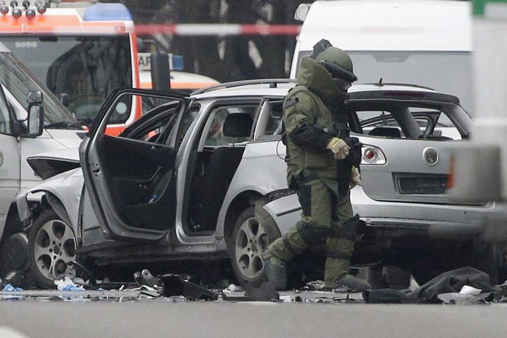 В "Твиттере" берлинской полиции появились фотографии и видеозаписи, на которых видна покореженная машина с выбитыми стеклами.