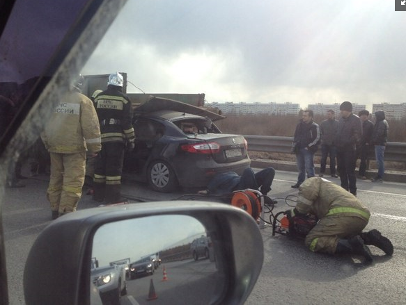Renault врезался в самосвал, в результате столкновения водитель легкового авто получил различные травмы. Для его спасения был вызван вертолет.