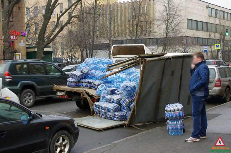 В результате аварии на проезжую часть высыпался груз - бутылки с водой. Кузов упал ровно между двумя припаркованными авто, не задев их.