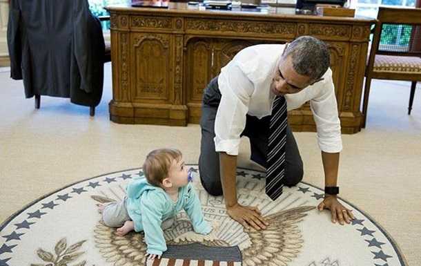 Фото с ползающей по полу президентского кабинета девочкой и Обамой, стоящим рядом с ней на четвереньках, опубликованы на сайте Barackphotos.com.