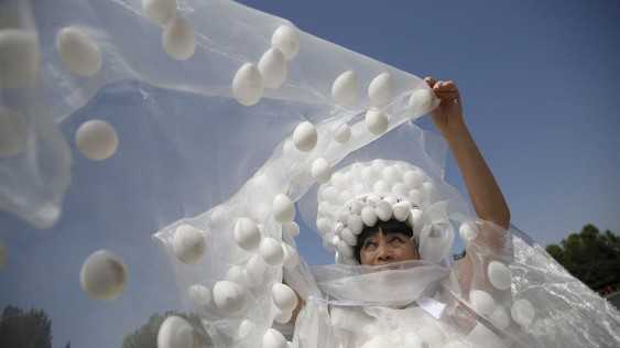 Китайская художница Нин Кун представила свадебное платье из тысячи яиц в честь Дня Земли. Предмет был показан перед Национальным центром исполнительских искусств в Пекине, которое в просторечии также называют "яйцом". О конкретном посыле автора платья не сообщается.