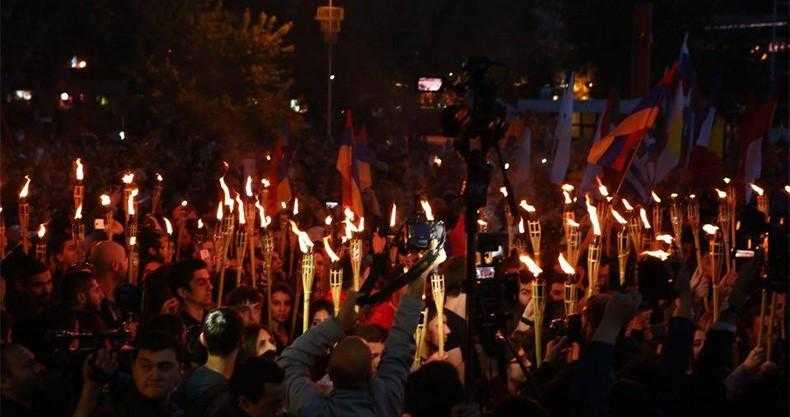 Сегодня, 23 апреля, в Ереване началось ежегодное факельное шествие памяти жертв Геноцида армян к мемориалу "Цицернакаберд". Группа молодых людей проносит огромные государственные флаги Армении и непризнанной Нагорно-Карабахской Республики.