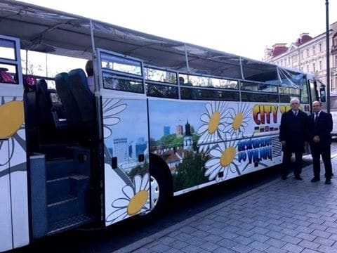 "4 мая в Вильнюсе стартовал большой экскурсионный автобус с аудиогидом на украинском языке. В церемонии начала использования украинского языка приняли участие посол Украины в Литве Владимир Яценковский, директор литовской компании "Valandele" Арнис Станкевичюс, президент Литовской туристической палаты Жидре Гавелене, представители литовской общественности, иностранные туристы и журналисты ведущих литовских СМИ", - говорится в сообщении.