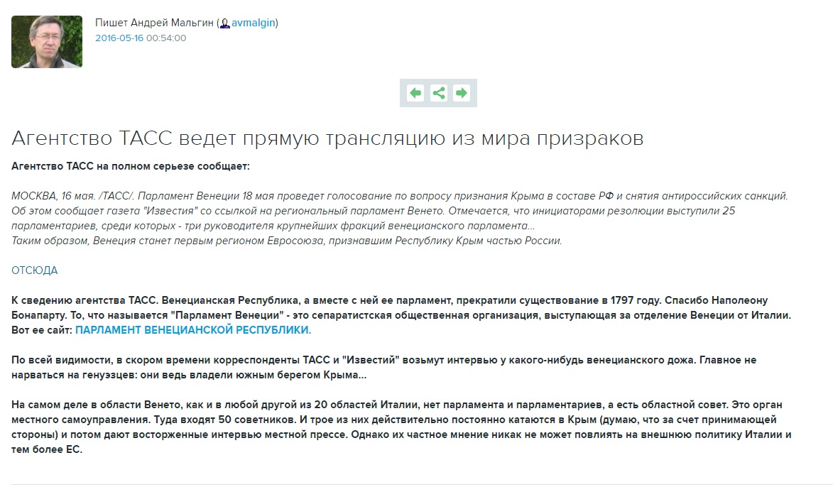 Российские СМИ невероятнейшим образом опозорились перед всей мировой общественностью. Серьезнейшие и авторитетные информационные издания России сообщили о том, что "18 мая парламент Венеции проведет голосование за снятие санкций с РФ и признание Крыма частью РФ".