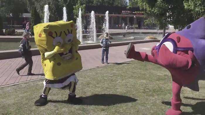 Двое аниматоров - «Губка Боб» и Ежик из «Смешариков» - не поделили между собой территорию, поэтому начали решать вопрос на кулаках. Дети, которые не поняли, что на самом деле происходит, радостно болеют то за одного, то за другого мультипликационного героя.