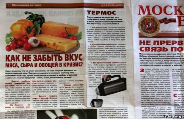 Ни то, ни другое, ни третье. Это памятка. На полном серьезе. Совет ветеранам. Как обойтись без еды… В майском номере издания "Московский Ветеран", со святым Георгием и неразлучным с ним драконом, перепоясанными георгиевской лентой. С обязательными портретами Президента Путина, Святого Патриарха Кирилла, Мэра Собянина, героя Советского союза летчика Маресьева, 60-70-летних ветеранов (интересно, какой войны?) в форме, обвешанных орденами медалями с ног до головы, весь цветной четырехполосный номер уважаемого издания посвящен патриотическому воспитанию молодого поколения.