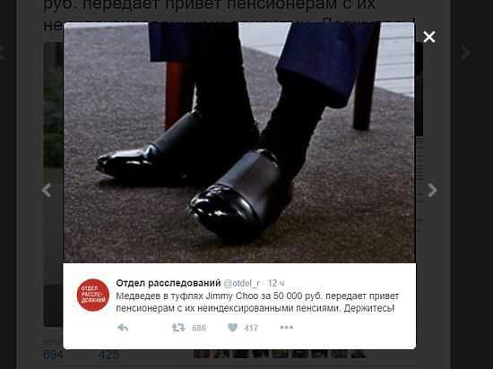 «Отдел расследований» в Twitter пишет, что таким образом «Медведев в туфлях Jimmy Choo за 50 000 руб. передает привет пенсионерам с их неиндексированными пенсиями».