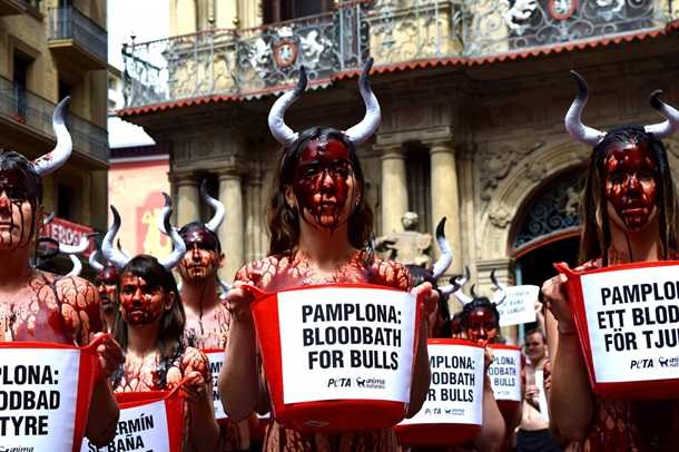 В испанском городе Памплона активисты, протестующие против убийства быков ради забавы, вышли раздетыми на городскую площадь. Участники акции громко скандировали лозунги и обливались кровью.