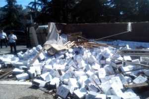ДТП произошло на кольцевой развязке, чтобы не допустить столкновения с другими автомобилями, водитель грузовика сманеврировал вправо. Но в результате перегруза и большого веса его прицеп перевернулся. Часть коробок с вином выпала на проезжую часть и обочину.