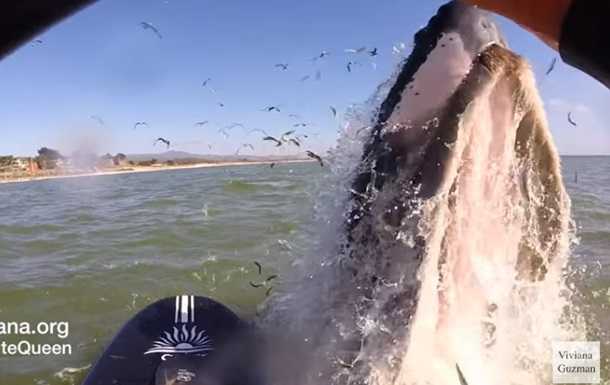 Серфингистка из Калифорнии смогла записать на видео редкие кадры столкновения с китом во время прогулки на воде.