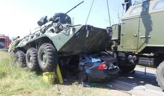 В Крыму сегодня утром произошла тяжёлая авария. Многотонный БТР буквально раздавил «Форд Фокус» вместе с находившимися там людьми. Два человека погибли.