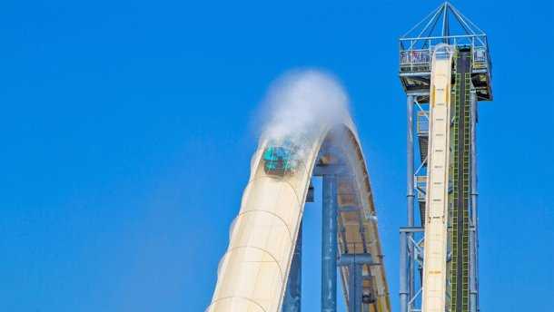 Справка: Аттракцион Verruckt — самая высокая в мире водная горка, ее высота составляет почти 52 метра, а скорость спуска достигает 110 км/ч.