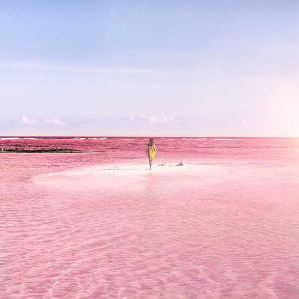 Неестественный розовый цвет воде придают особые фитопланктоны, а расположенные рядом соляные берега белого цвета придают месту особый шарм.