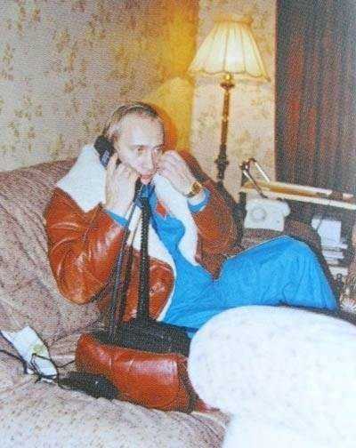 На фото Путин сидит на диване в коричневой дубленке, под ней одет яркий спортивный костюм, рядом лежит сумка в тон дубленки. На левой руке массивные часы – любимый аксессуар будущего президента РФ.