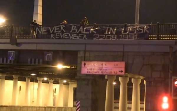 На Бородинском мосту в Москве активисты в ночь на 21 августа развернули большой плакат с надписью "Never Back in USSR. Remember 22.08.1991".