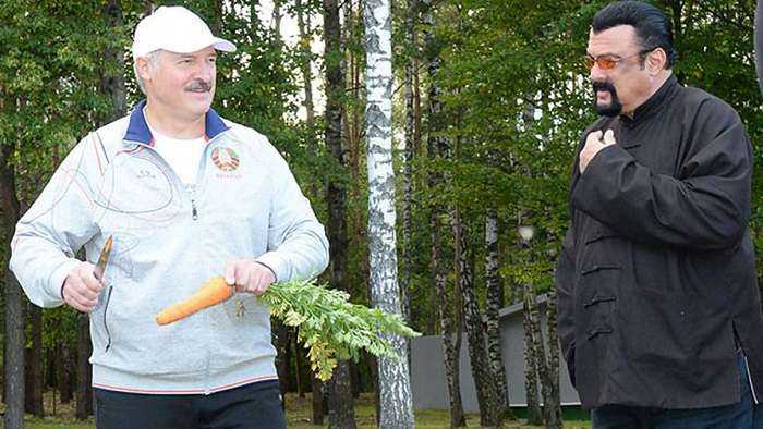 Президент Беларуси и актер провели неформальную встречу, во время которой президент Лукашенко пригласил Сигала посетить его грядку и там угостил артиста морковью.
