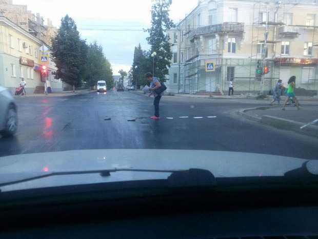 – Ничего необычного, просто женщина переходит дорогу…Да, она кладет листики, чтобы не прилипать к асфальту, – так подписал свой снимок в Facebook российский блогер Илья Варламов.