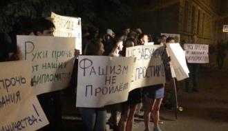 Отмечается, что вначале митингующие скандировали лозунги: «Хунту к ответу», «Помним Одессу, помним Донбасс», «Не забудем, не простим», «Руки прочь от наших дипломатов», разворачивали плакаты с подобными надписями, а затем зажгли фаеры.