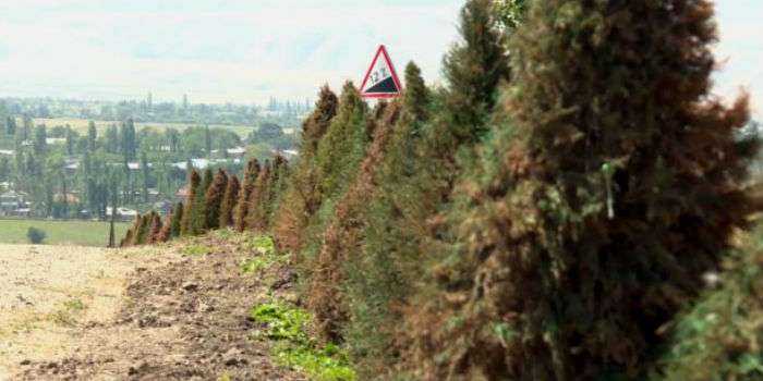 Вокруг Мемориального комплекс Ата-Беит, который наверняка посетят участники саммита, за одну ночь внезапно позеленели елки. Но больше всего поразило то, что задняя часть как елок, так и туй осталась серо-коричневой.