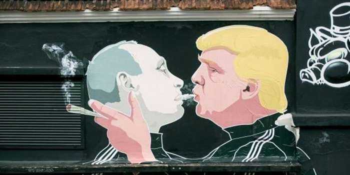 В Вильнюсе появилось новое граффити-карикатура на Путина и Трампа. В этот раз поцелуй политиков сменился на курение косяка марихуаны.