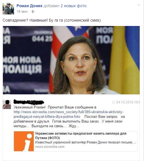 Сегодня Доник опубликовал скриншот сообщения, которое ему прислали после вышеупомянутой публикации. "Готов выполнить Ваш заказ. У меня свои методы. Выходите на связь. Жду", - написал потенциальный "киллер".