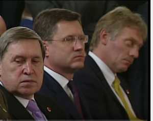 Наиболее крупным планом спящего путинского пресс-секретаря видно на записи трансляции в период 6:44 – 6:53. Также камера запечатлела, как глава российского МИДа Сергей Лавров весьма озабоченно посмотрел на Пескова, но будить спящего пресс-секретаря не стал.
