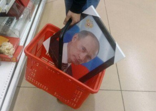 Так, на фотографии изображен мужчина, который держит корзину для покупок с портером Путина в нем. «Продуктовая корзина патриота», - говорится в подписи к фото.