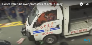 Полицейские Манилы устроили жесткий разгон демонстрации против присутствия войск США на Филиппинах. Сначала полиция применила слезоточивый газ и водометы. Затем мини-грузовик копов несколько раз протаранил толпу, нанеся телесные повреждения десяткам участников акции протеста.