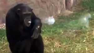 В сеть попало видео, на котором запечатлена курящая шимпанзе Азалия. Животное живет в зоопарке Пхеньяна, выкуривает пачку сигарет за один день и умеет пользоваться зажигалкой.